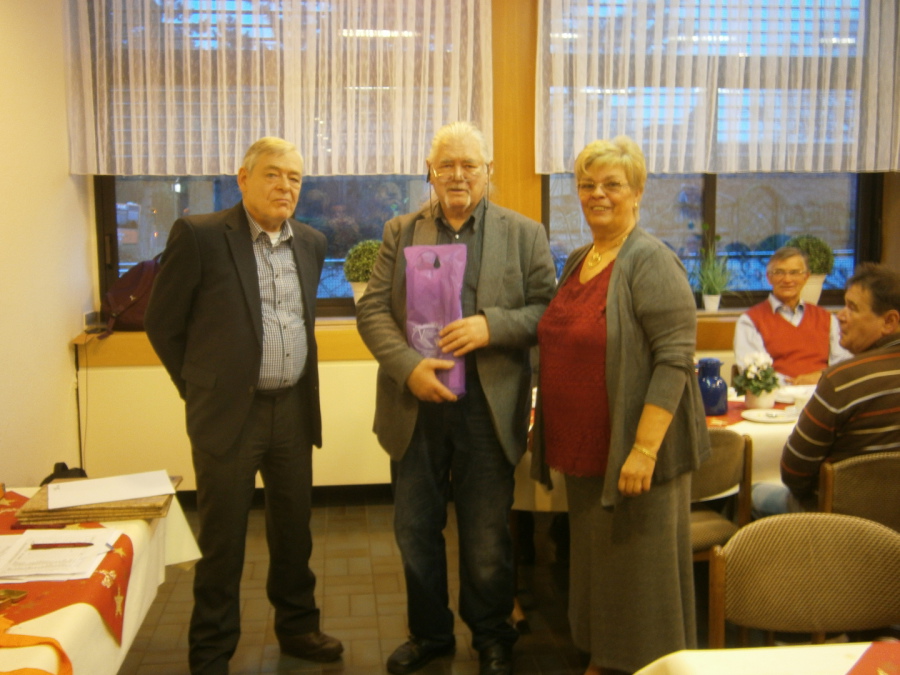 Leider musste der Vorsitzende den langjährigen Beisitzer und "Fachmann" für die Schwerbehinderten, Norbert Schulz, auf eigenen Wunsch aus dem Vorstand verabschieden. Wolfgang Palm bedankte sich bei Norbert für seine herausragende Arbeit in den letzten 9 Jahren mit einem Weinpräsent.