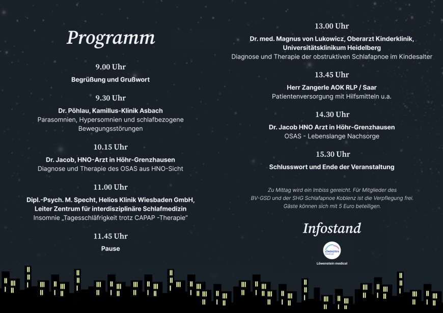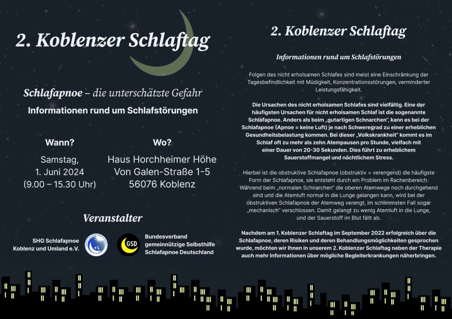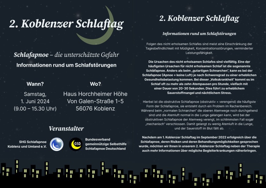 Am 24.09.2022 veranstaltet die Selbsthilfe Schlafapnoe Koblenz und Umland e. V. den 1. Koblenzer Schlaftag unter dem Motto "Schlafapnoe die unterschätzte Gefahr einer neuen Volkskrankheit". Fünf renomierte Referenten werden in ihren Vorträgen das Thema Schlafapnoe und andere Schlafstörungen beleuchten und stehen für Fragen zur Verfügung.